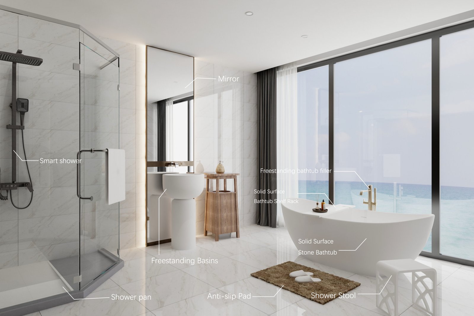 It also includes wall and floor materials, shower systems, plumbing fixtures, and all of the other smaller accessories that will make the space complete.