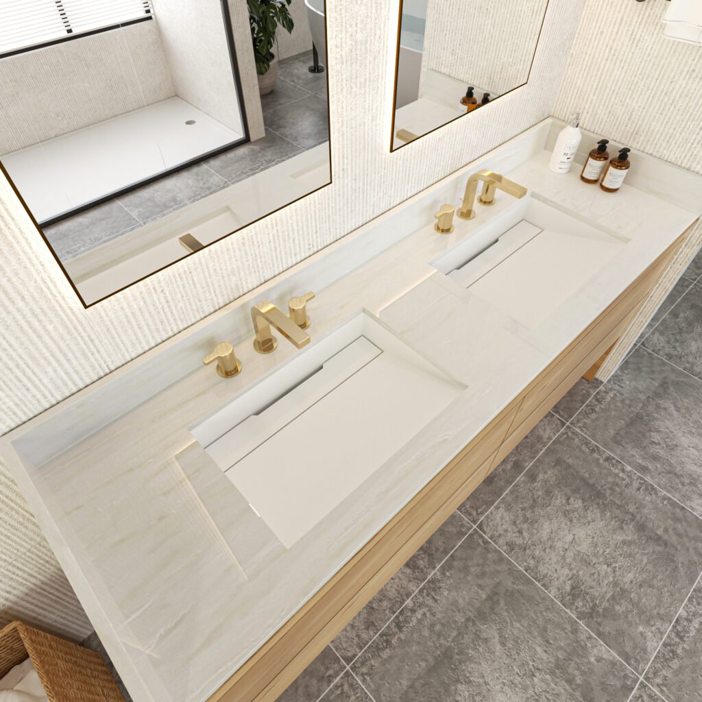 One of the most significant advantages of solid surface materials is the ability to produce integrated sink countertops. Instead of installing the sink separately, the sink and vanity top are molded together into a single continuous surface.