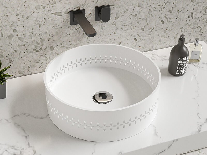 A solid surface basin is made from a blend of acrylic, polyester resins, and natural minerals. The scratches on the surfaces can be sanded out and refinished, which extends the lifespan of the bathroom sink.