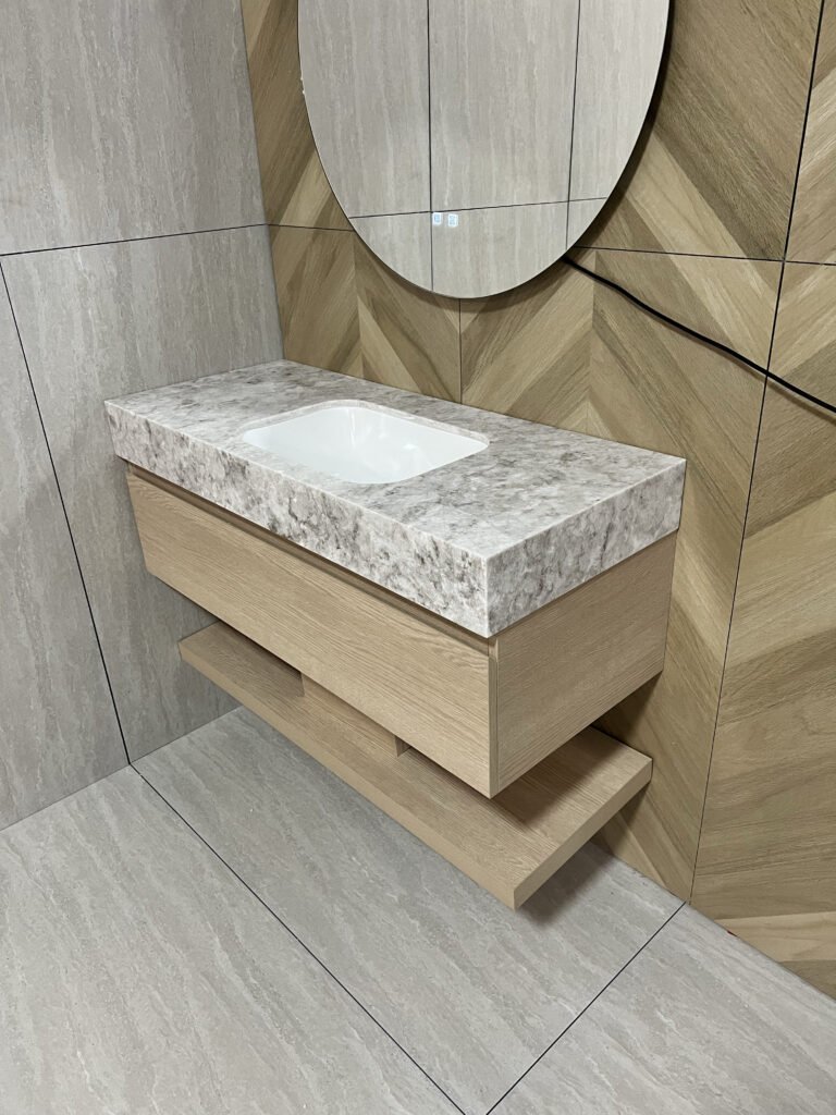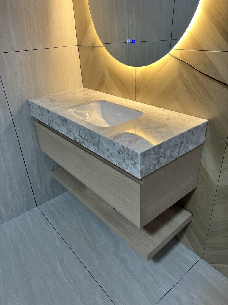 Pro Tip: Choose a solid surface integrated basin and countertop — one continuous piece with no seams, no gaps, and no hidden moisture traps.
