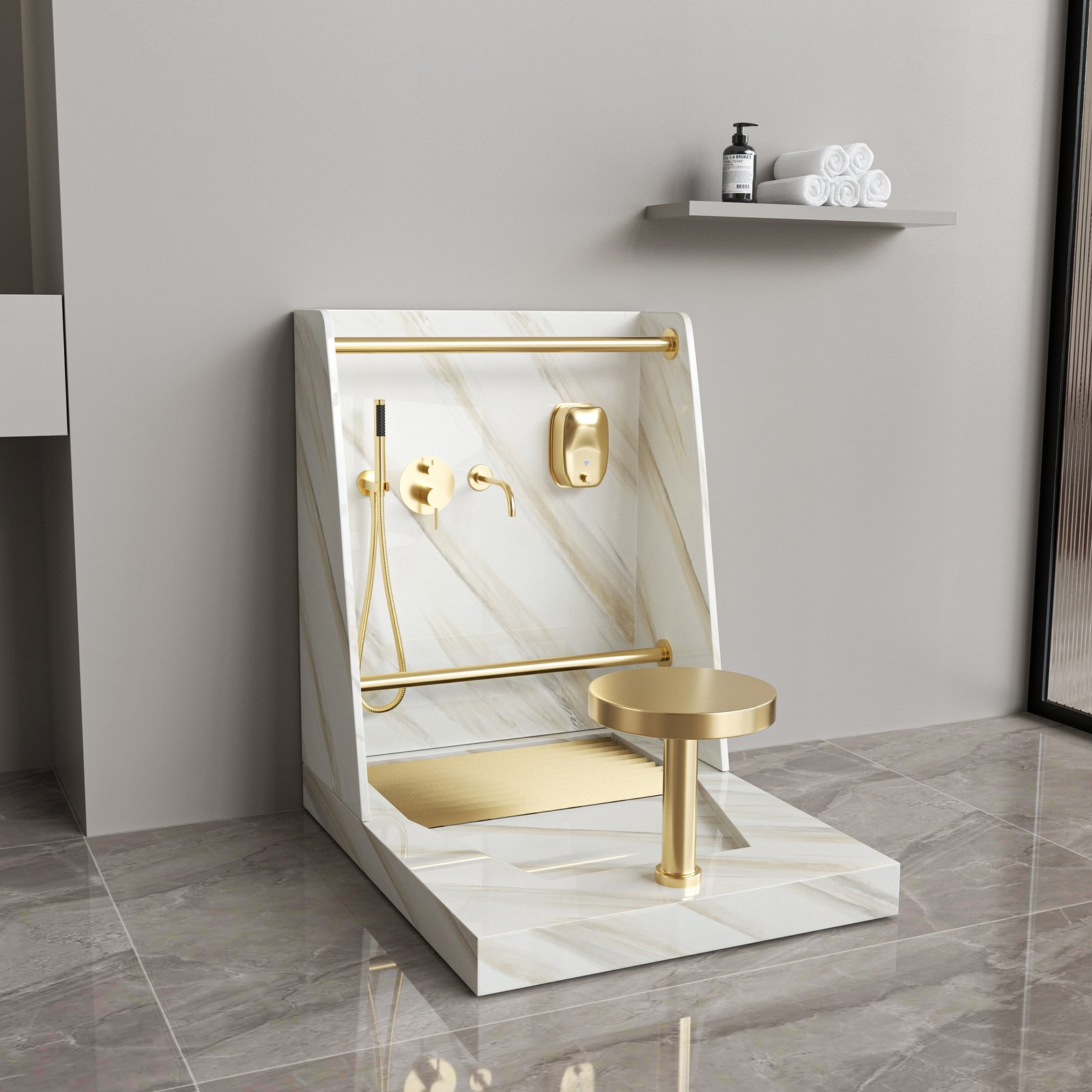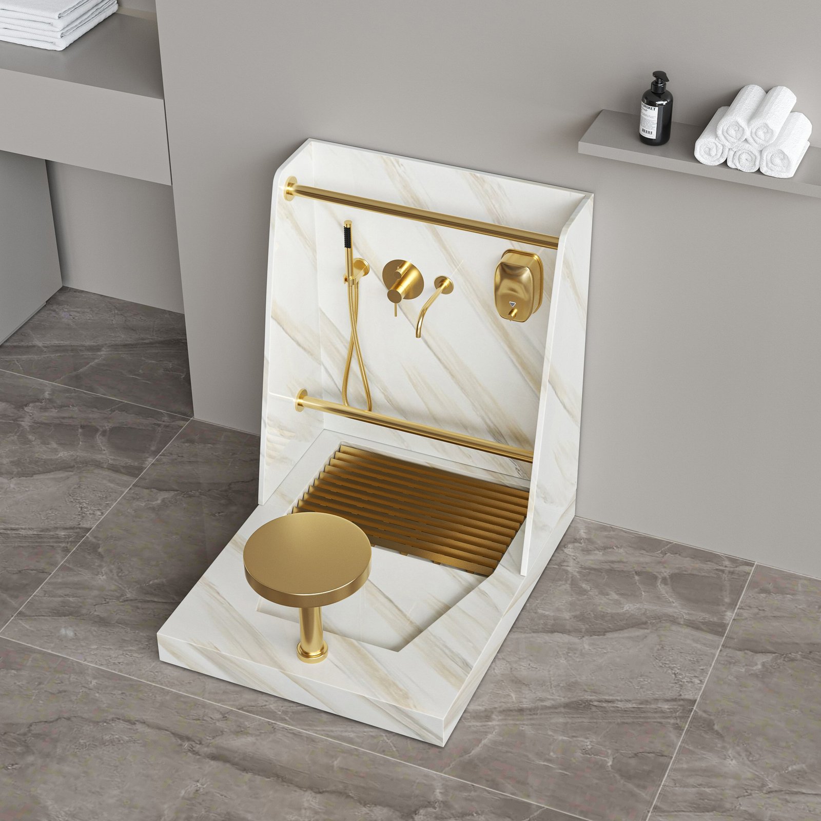 Elegant beige marble texture Wudu Wash Station designed for mosque ablution areas, Islamic centers, and luxury prayer facilities. Solid surface construction, anti-slip base, ergonomic seating, and gold fixtures. Fully customizable for projects.