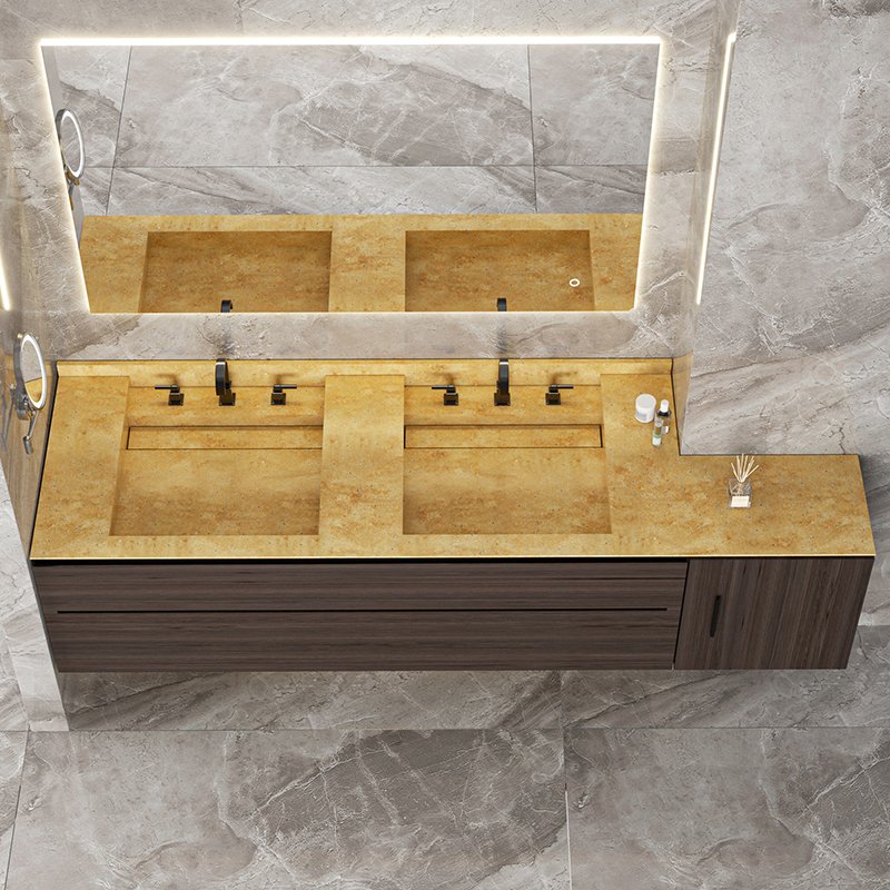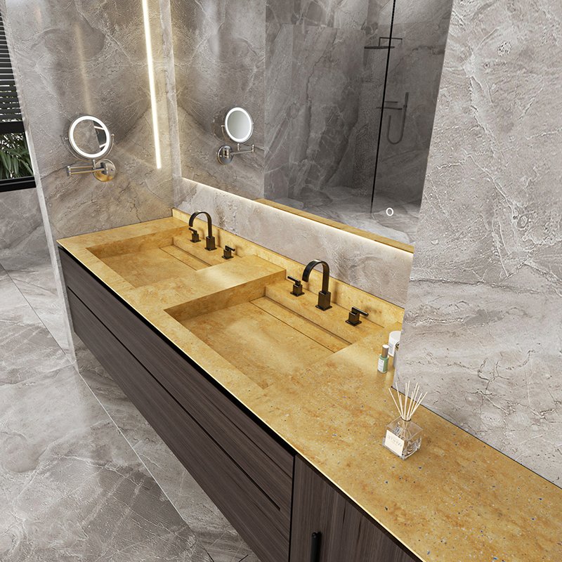 Featuring a custom-engineered asymmetric basin layout, the vanity integrates sculpted wash zones, extended deck space, and precision-cut edges into one seamless solid surface structure. The gold marble color tone delivers a warm, premium aesthetic that elevates hospitality bathrooms, executive suites, and signature villas.