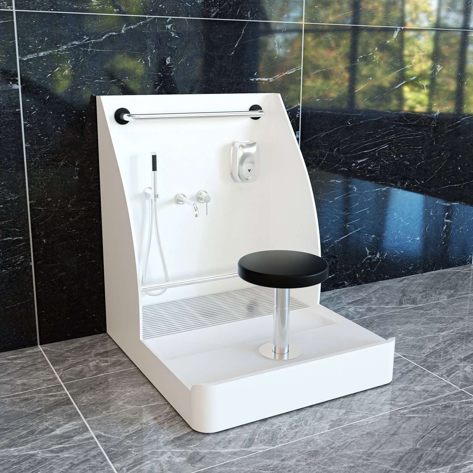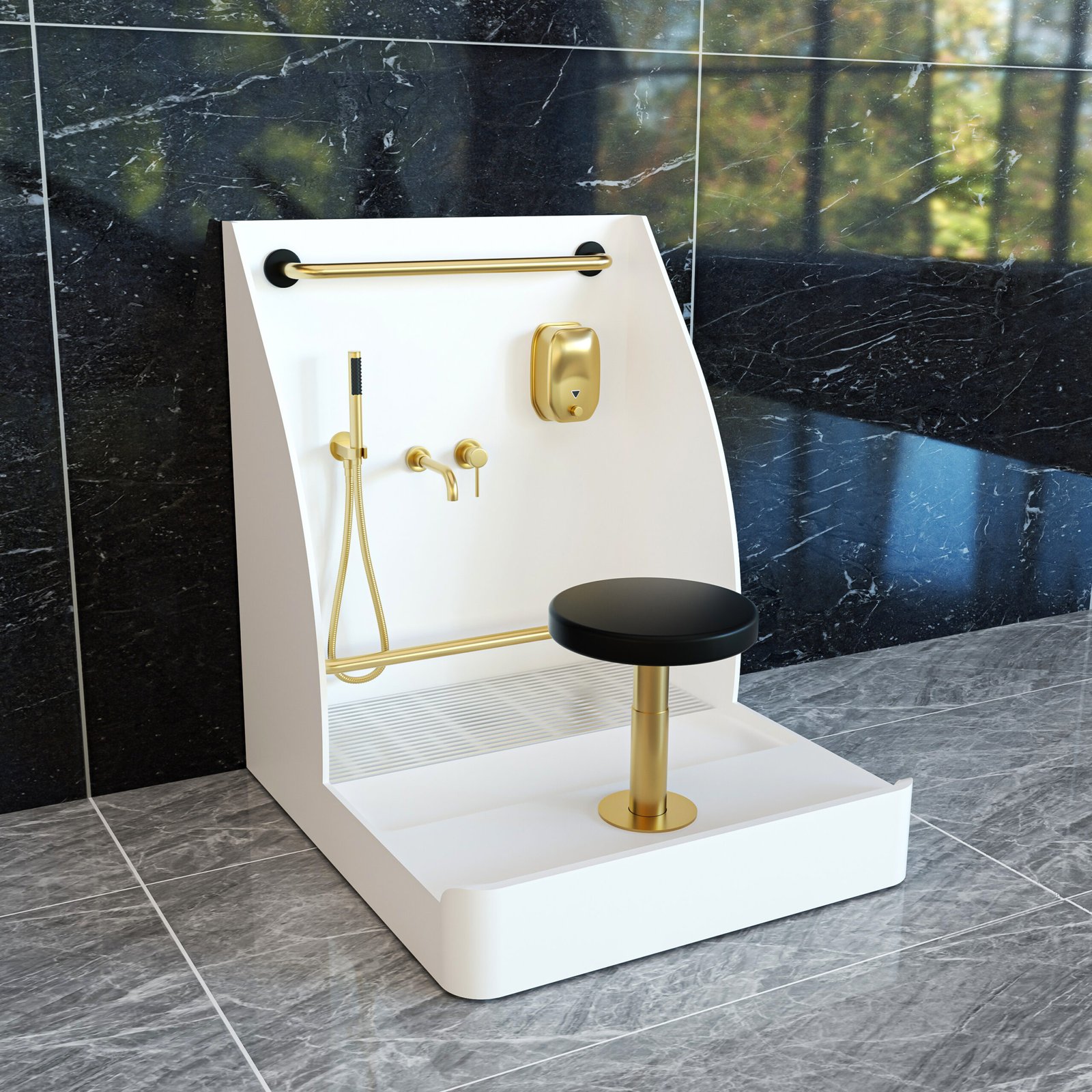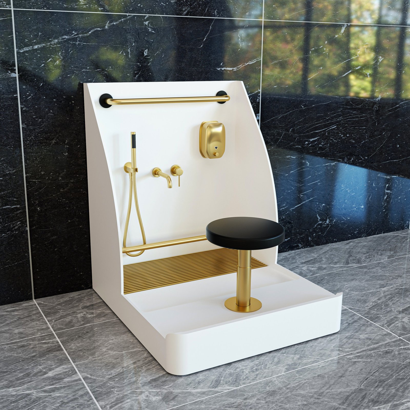 Marble Patterned Solid Surface Wudu Sink with Seat & Hand Shower | Custom Islamic Ablution Station for Mosques & Hotels