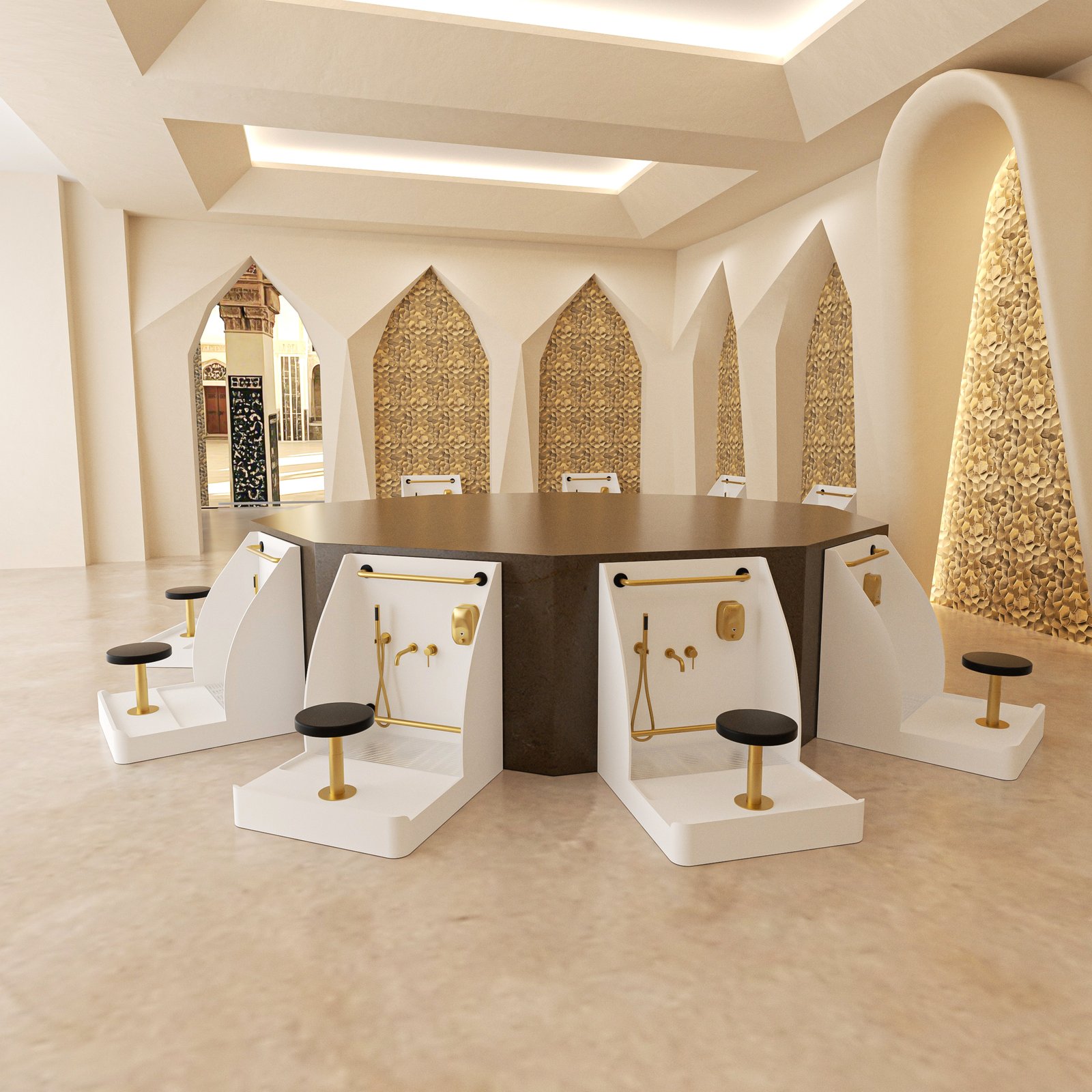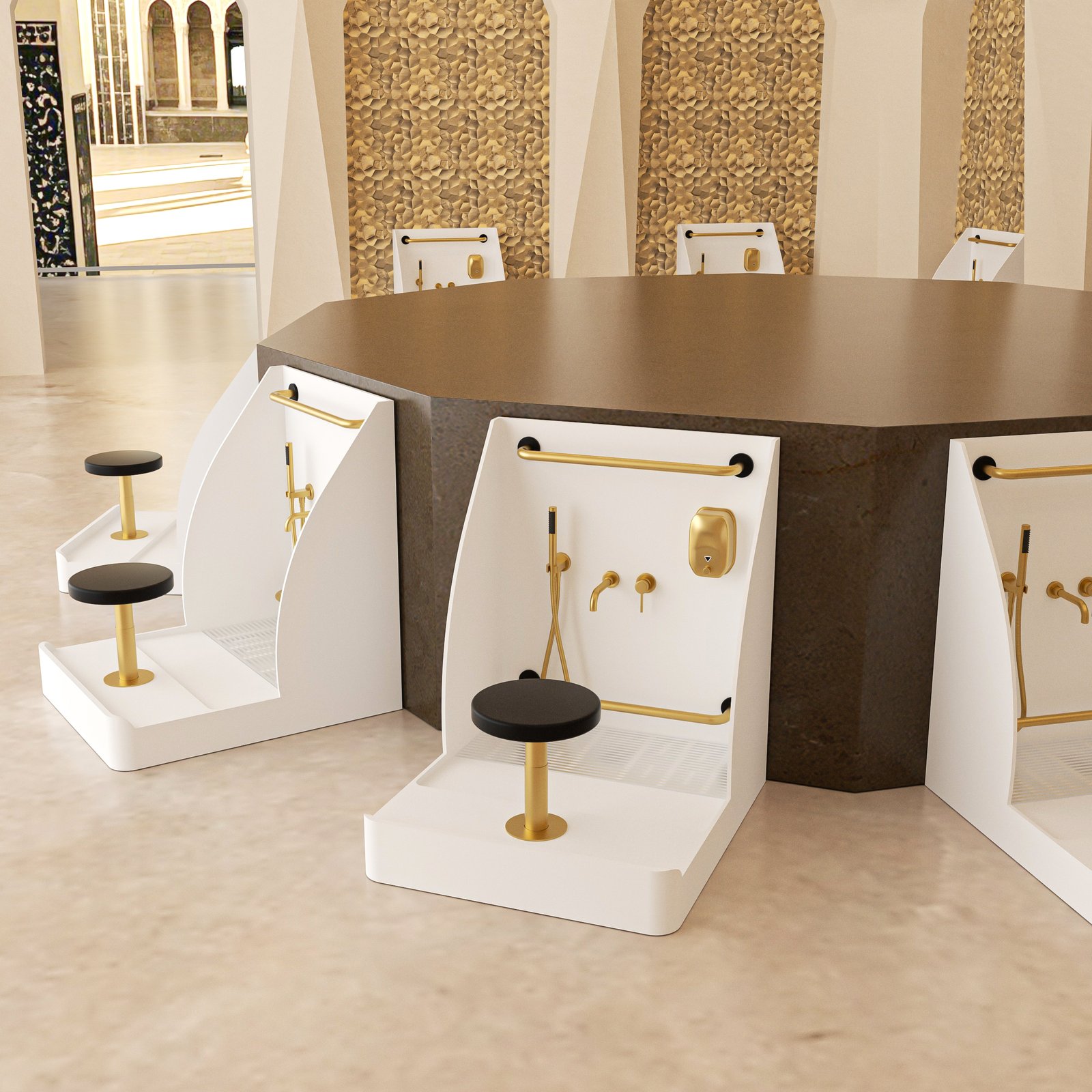 The station features a smooth curved back panel design that reduces water splash while creating a modern and elegant appearance suitable for contemporary mosque interiors.