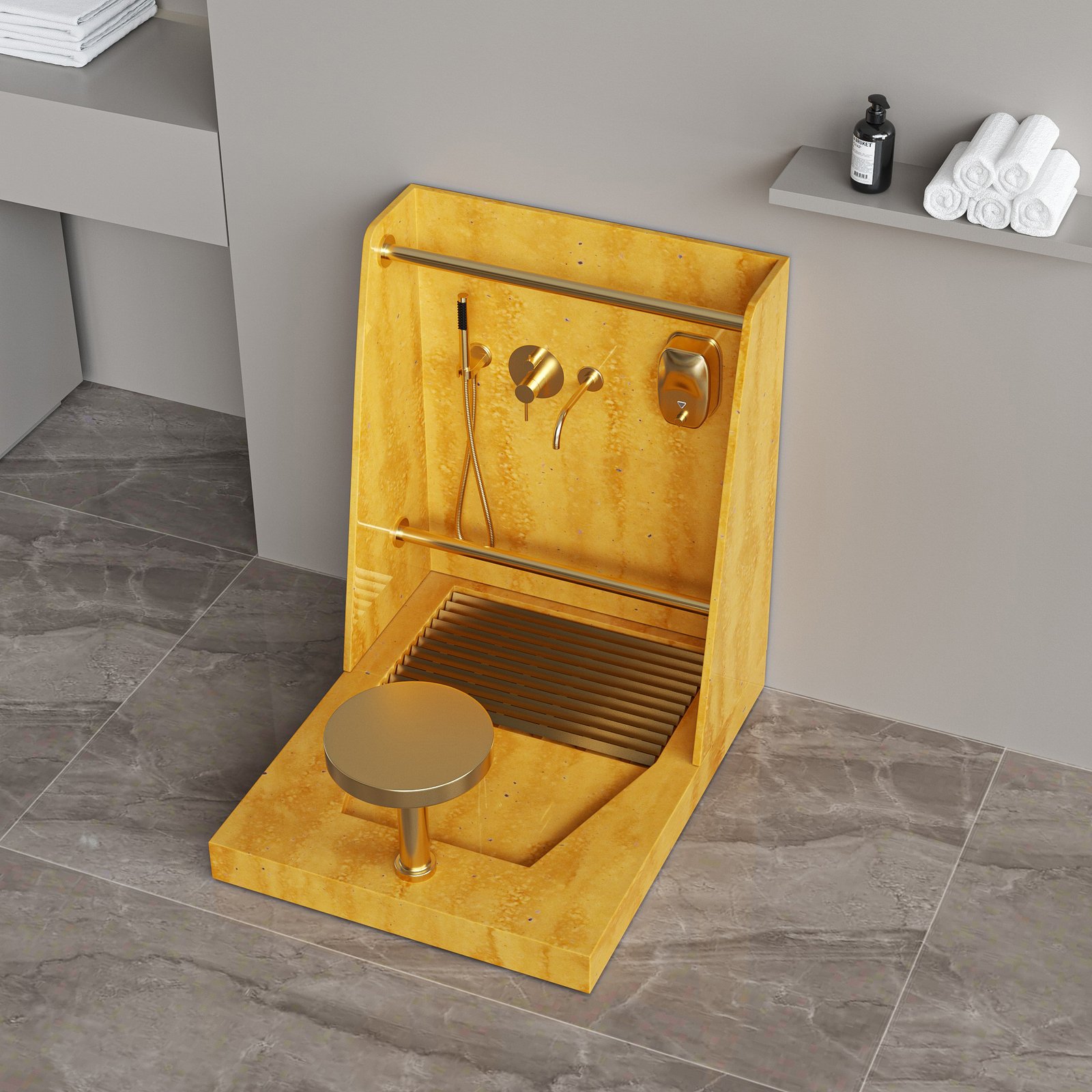 This Golden Amber Marble Wudu Sink Station is engineered for mosque ablution areas that require visual warmth, durability, and professional-grade performance.