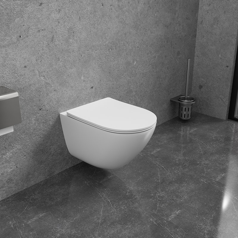 Rimless wall hung toilet with hidden outlet design and slim soft-close seat, offering modern aesthetics and hygienic performance for hotels, apartments, and contemporary bathrooms.