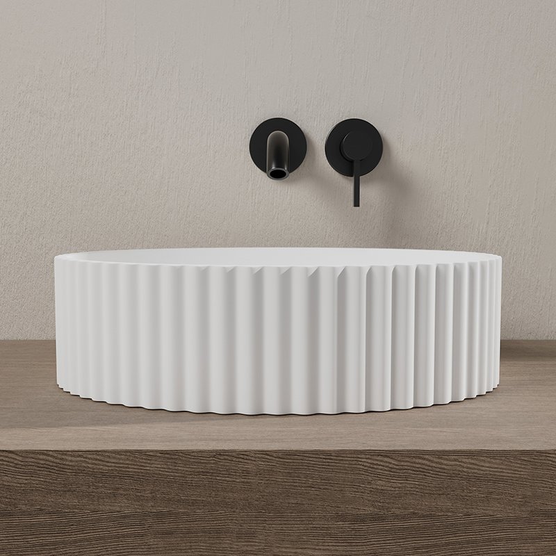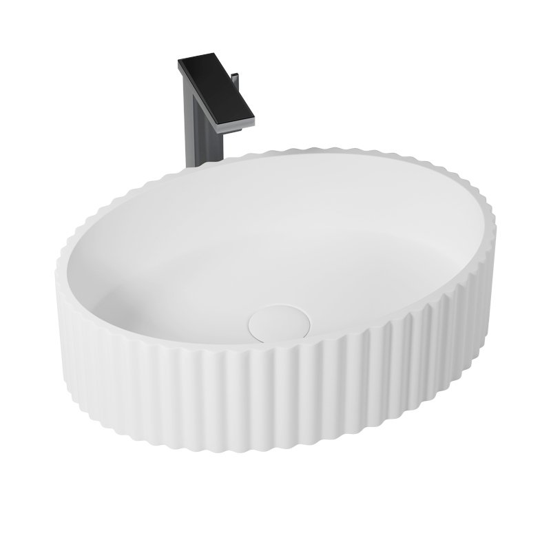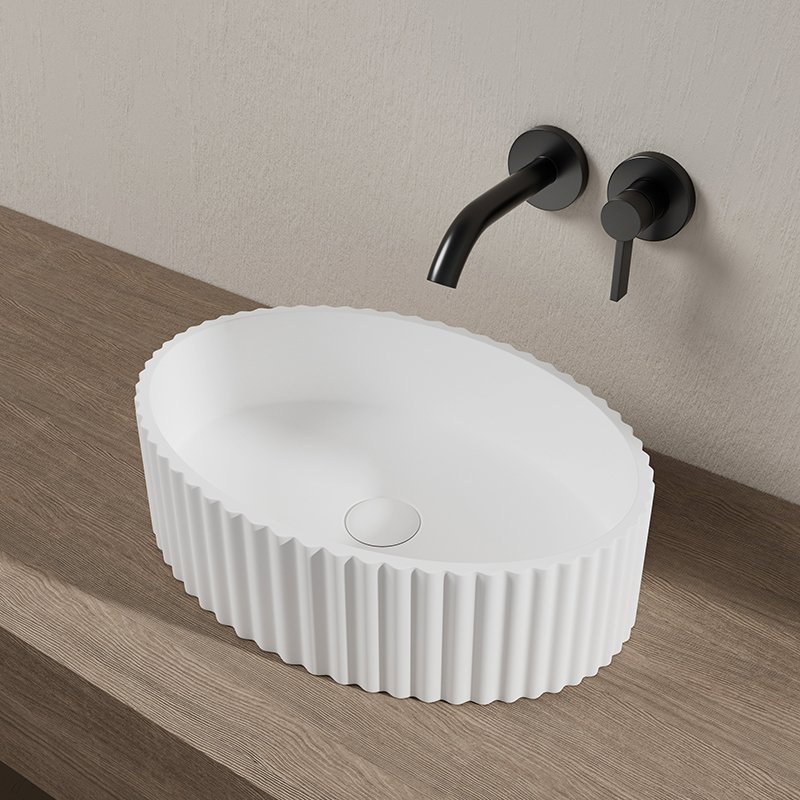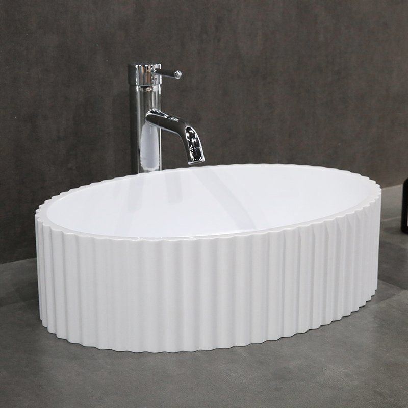 A designer fluted oval solid surface vessel sink in matte white. Durable, seamless, and ideal for boutique hotels, luxury apartments, and premium residential projects.