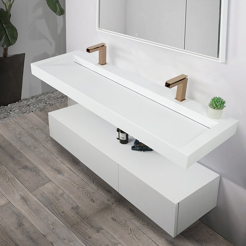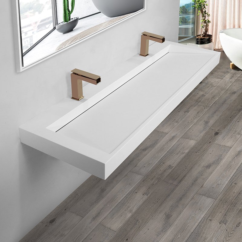 A wall-mounted solid surface trough basin with linear slot drain, designed for hotels, commercial bathrooms, and custom projects requiring a clean, floating architectural look.