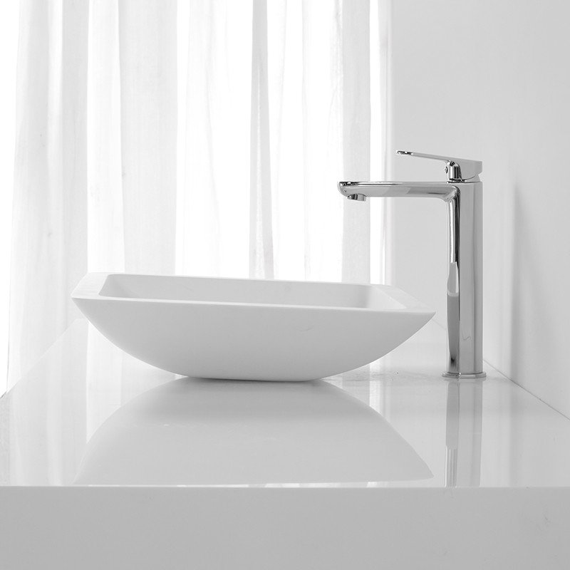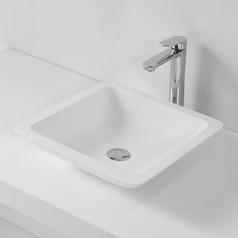 A modern square solid surface vessel sink in matte white. Seamless, hygienic, durable, and ideal for hotel, apartment, and premium residential bathroom designs.