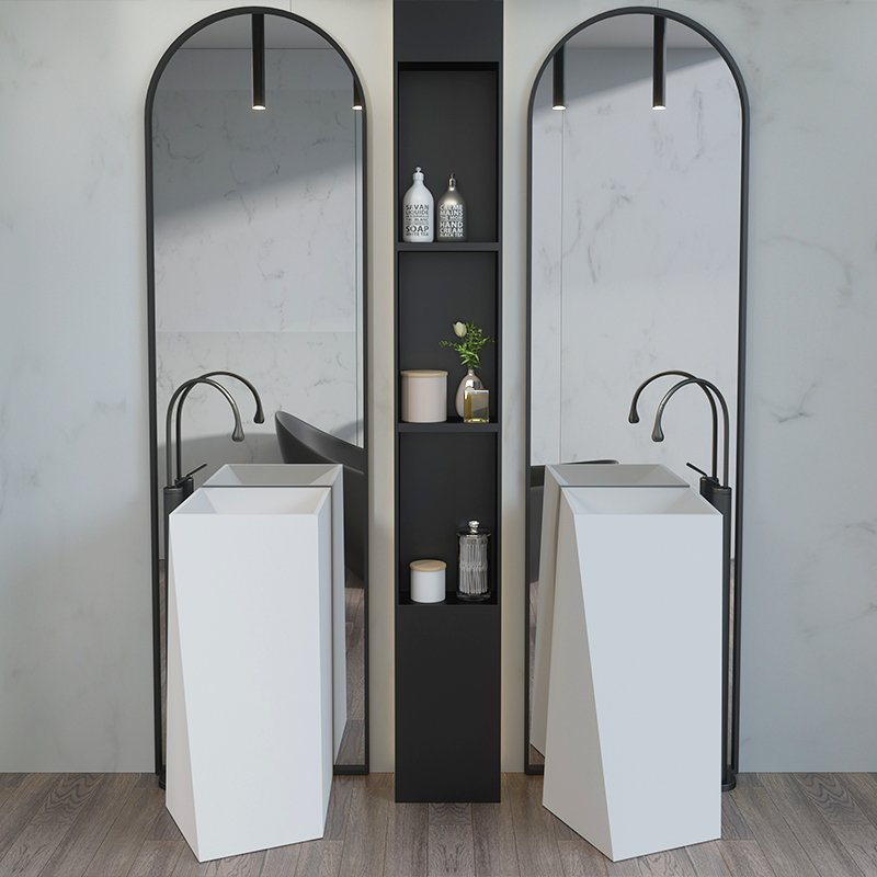A sculptural solid surface pedestal basin with a sharp geometric form, designed for modern luxury bathrooms and architectural interiors.