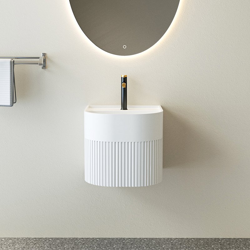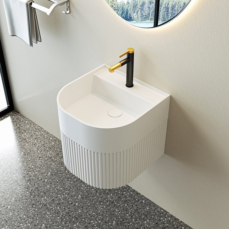 The KKR-1625 is a wall-hung solid surface sink designed with a soft curved front profile and vertically fluted exterior, creating a refined balance between architectural detail and minimalist form.