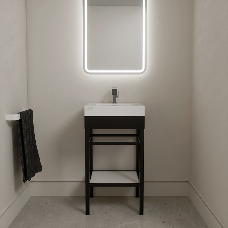 The KKR-1804 is a compact freestanding console sink designed for modern bathrooms that require a clean architectural look with flexible placement. It features a square integrated solid surface basin combined with a minimalist metal support frame, offering both visual lightness and structural stability.