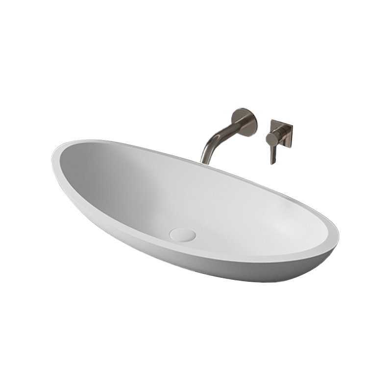 An extra-long oval solid surface vessel sink in matte white. Sculptural, seamless, and ideal for hotels, villas, and premium residential projects.
