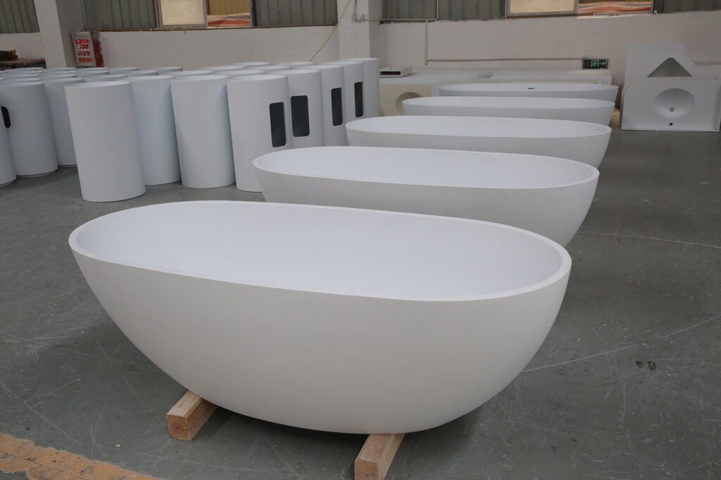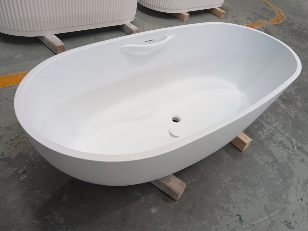 A sleek oval freestanding solid surface bathtub with a modern slim-edge profile. Seamless, durable, hygienic, and perfect for hotels, spas, and luxury residential projects.