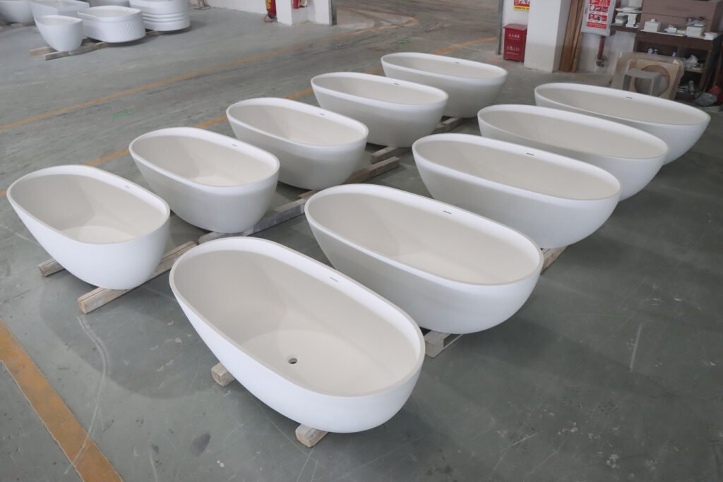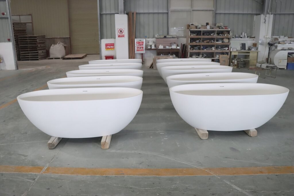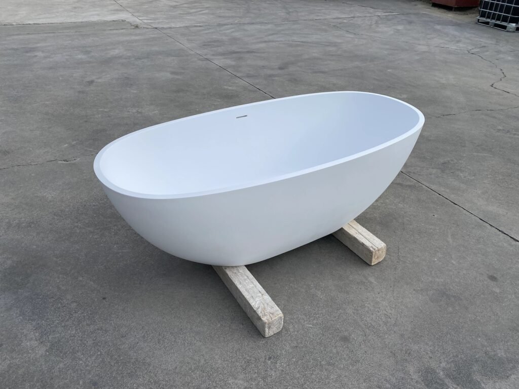 A modern oval solid surface freestanding bathtub with a slim-edge design. Seamless, durable, hygienic, and ideal for hotels, wellness suites, and luxury residential projects.