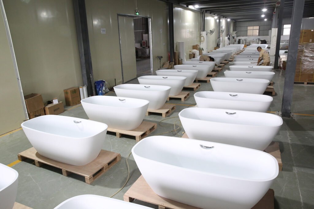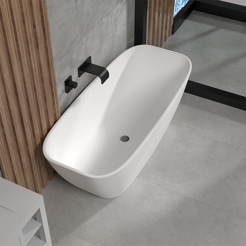 A modern freestanding solid surface bathtub with smooth contours and a comfortable soaking interior. Durable, seamless, hygienic, and ideal for hotels, serviced apartments, and luxury homes.