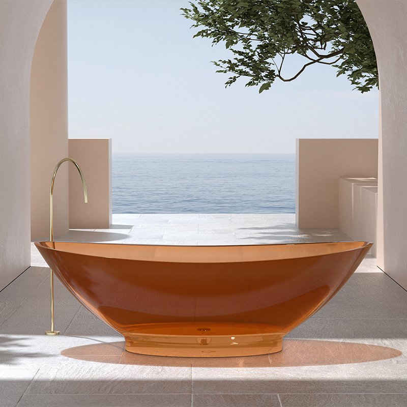 An amber oval transparent bathtub made from clear resin, designed for luxury hotels, villas, and spa projects that require a bold yet elegant freestanding bathtub solution.