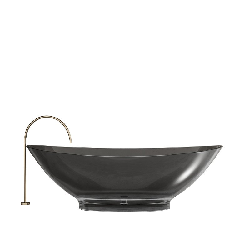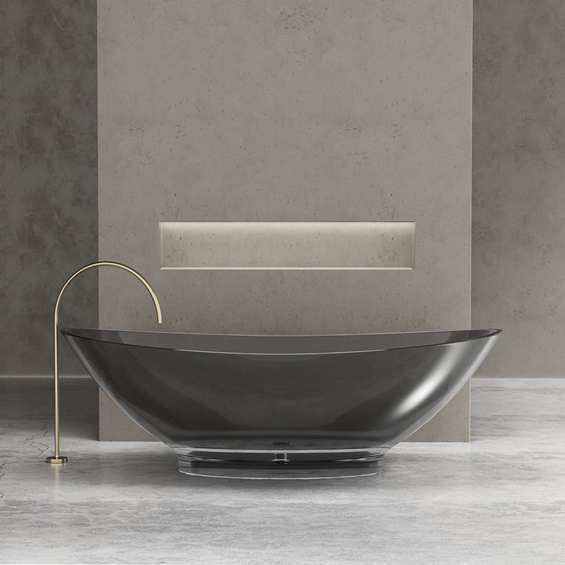 Featuring a wide, curved silhouette with a low-profile base, this bathtub combines elegant proportions with a deep soaking capacity. The smoky gray transparent finish creates a refined balance between privacy and visual depth, allowing light to pass through the tub body while maintaining a calm, architectural presence in the bathroom space.