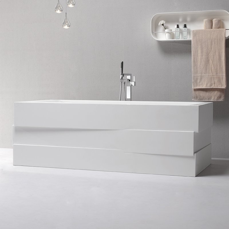 Rectangular freestanding solid surface bathtub with a sculpted ergonomic interior, combining architectural design, soaking comfort, and flexible installation for high-end bathroom projects.