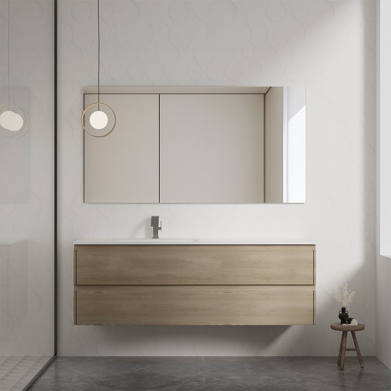 Bathroom vanity cabinets are primarily constructed from solid wood, selected for its structural strength, natural aesthetics, and long-term durability. Solid wood provides excellent load-bearing performance, making it suitable for supporting basin weight, countertop use, and daily opening and closing of drawers and doors.
