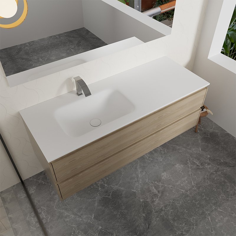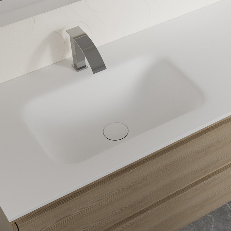 The sink and countertop are manufactured as a single solid surface piece, ensuring a seamless, joint-free structure. This integrated design improves hygiene performance, prevents water penetration, and simplifies daily cleaning—key considerations for high-traffic residential and hospitality environments.