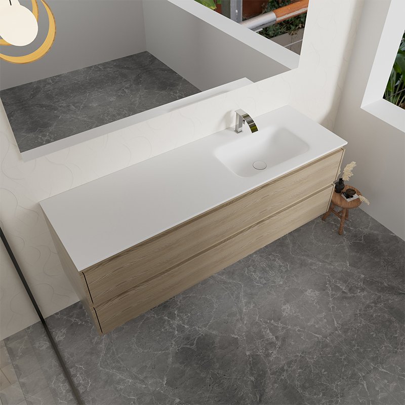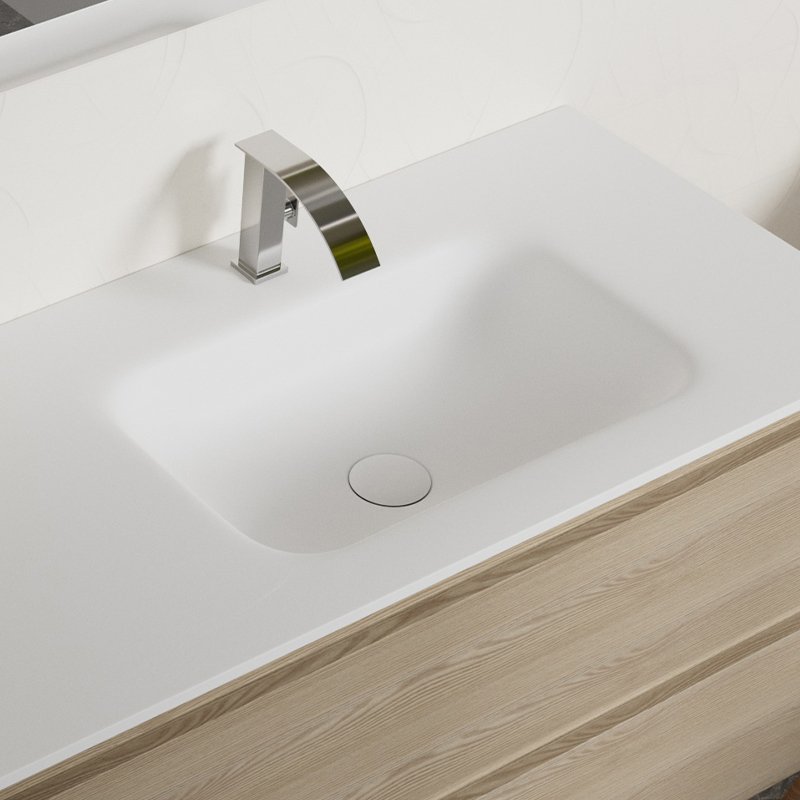 The sink and countertop are formed as a single, monolithic solid surface piece, eliminating joints, seams, and silicone lines. This integrated construction improves hygiene, reduces long-term maintenance, and ensures consistent material color and texture across the entire vanity top.