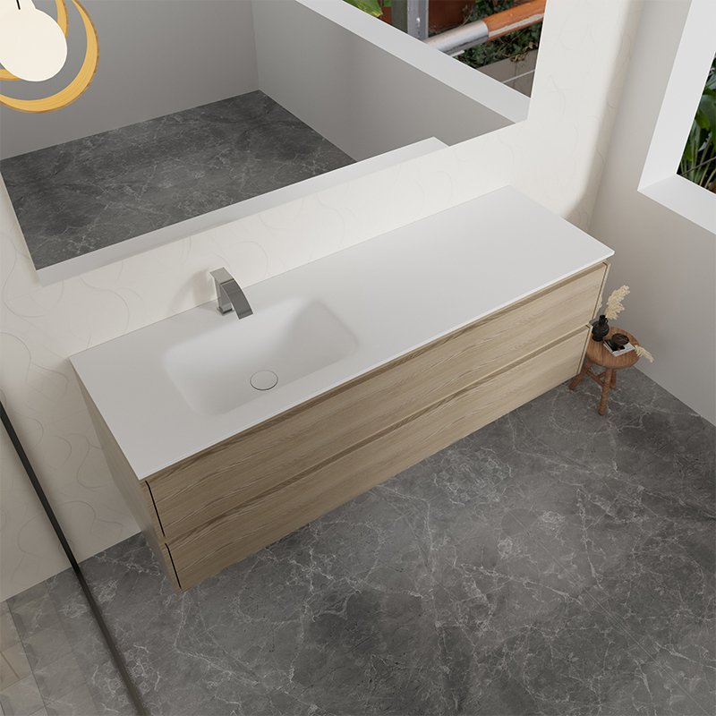 The sink and vanity top are crafted as a single seamless solid surface structure, ensuring excellent hygiene performance, easy maintenance, and long-term durability. The offset bowl design improves daily usability while giving designers greater flexibility in matching mirror cabinets, tall storage units, or wall accessories.
