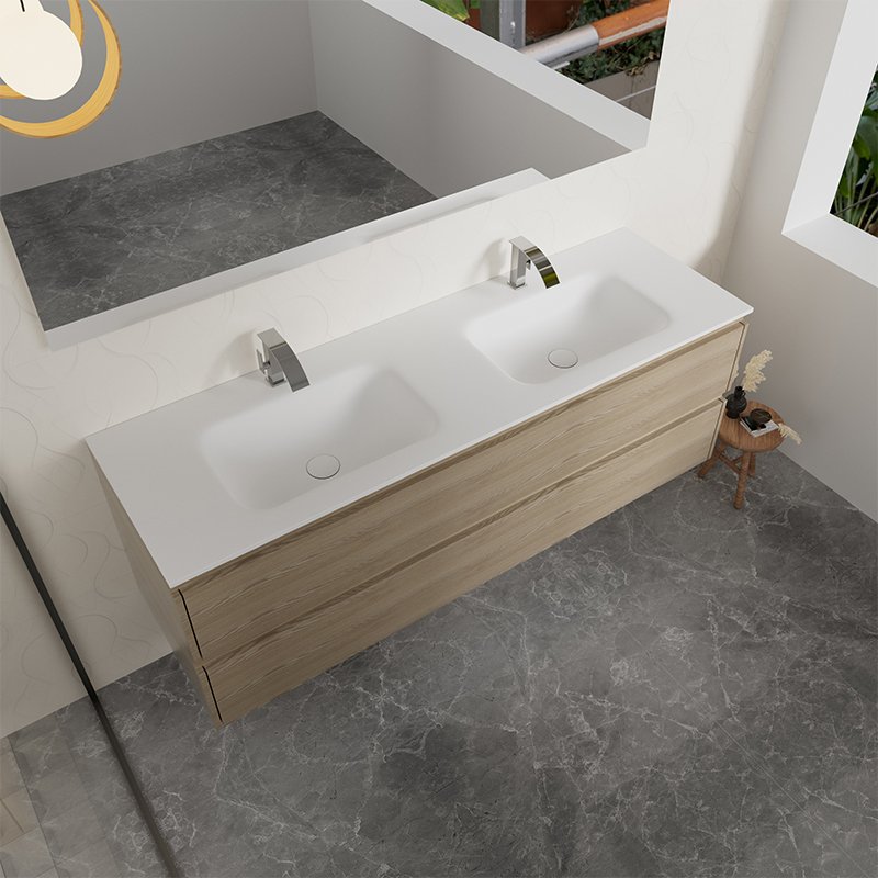 Solid Surface Double Integrated Sink Vanity with Soft Rounded Corners – Natural Wood Finish Cabinet