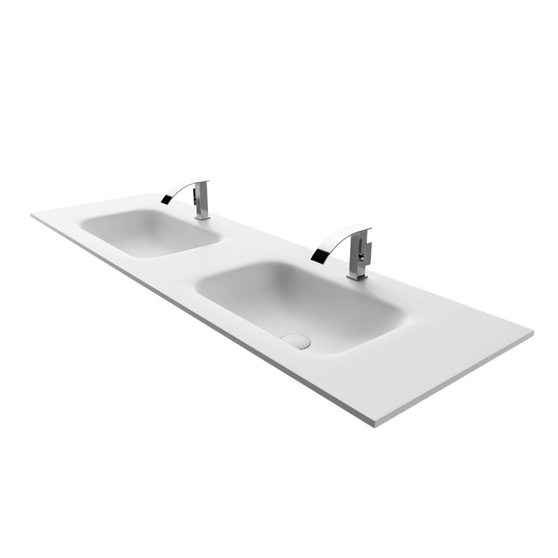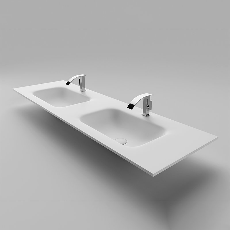 The one-piece integrated construction eliminates joints between sinks and countertop, significantly reducing maintenance effort and improving long-term hygiene performance. Each basin is ergonomically shaped to ensure comfortable daily use, while the spacing between the two sinks allows simultaneous operation without crowding.