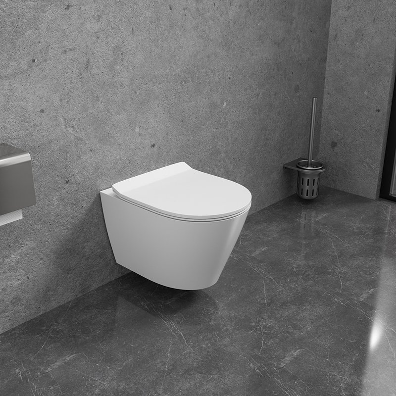 Compact rimless wall mounted toilet with slim soft-close seat, designed for modern bathrooms, hotels, and apartment projects.