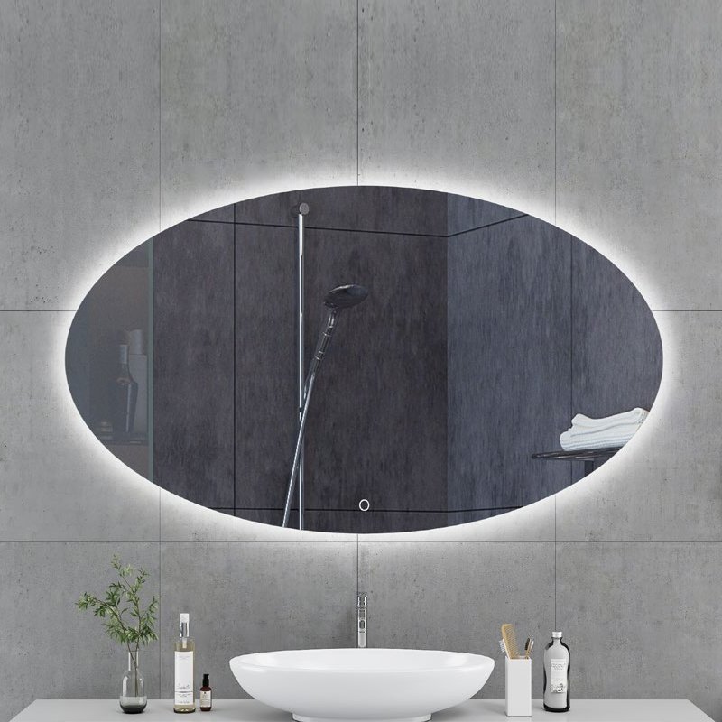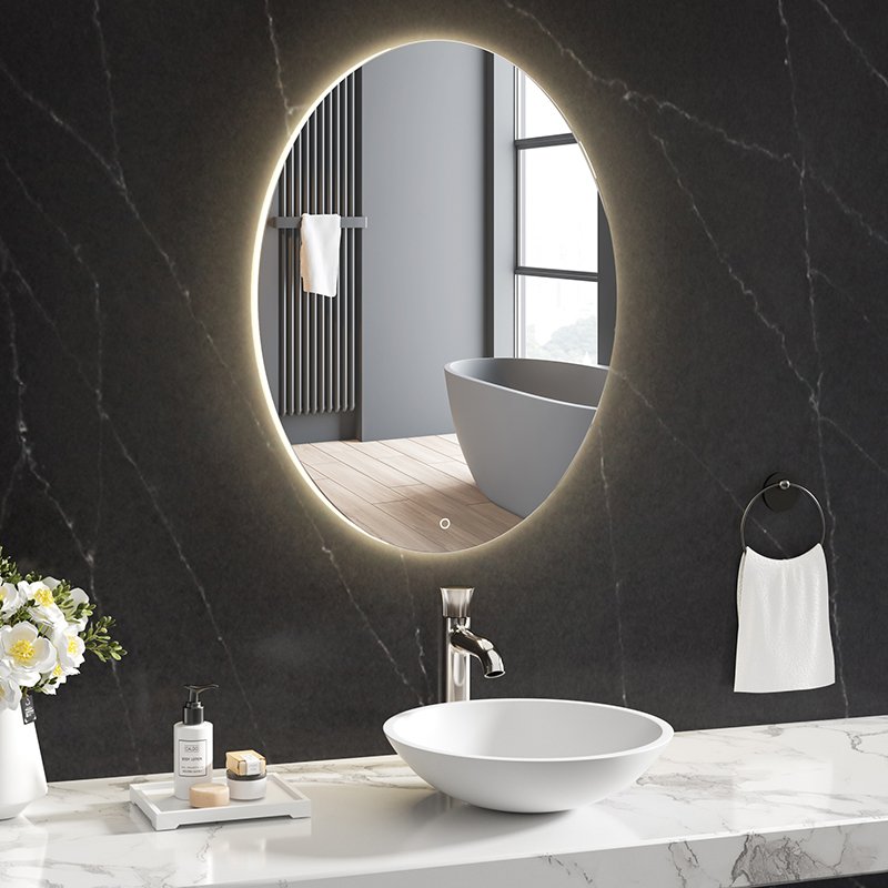 Oval LED bathroom mirror with soft backlit illumination, anti-fog function, and multiple vertical sizes. Ideal for modern hotel and residential bathrooms.