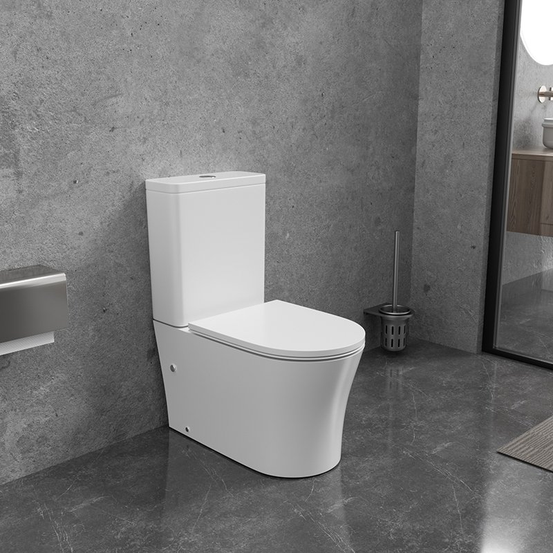 Compact rimless two-piece washdown toilet with dual flush 3L/4.5L, slim soft-close seat, and durable ceramic construction. Designed for apartments, hotels, and modern bathrooms with limited space.