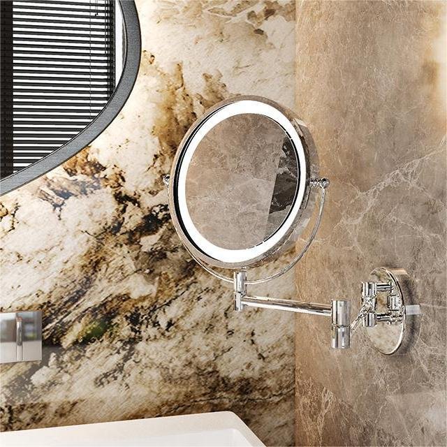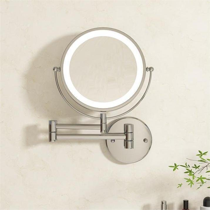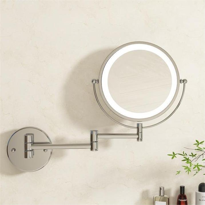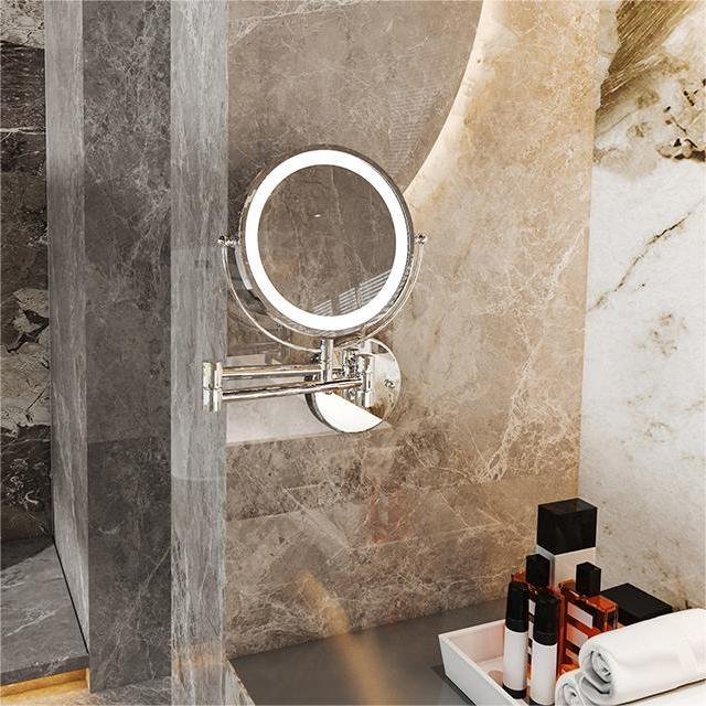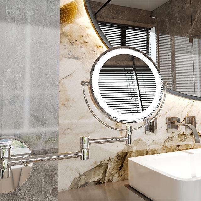 Wall mounted LED makeup mirror with 3X magnification, stainless steel frame, and hotel-grade construction. Available in chrome, matte black, and brushed gold.