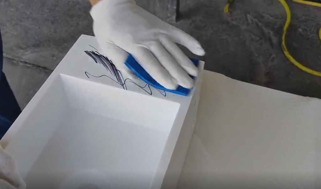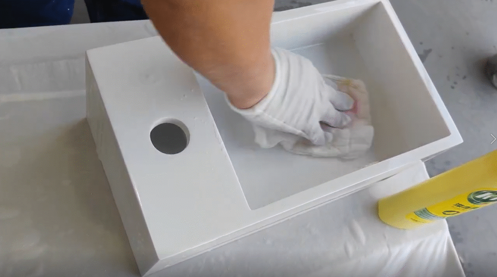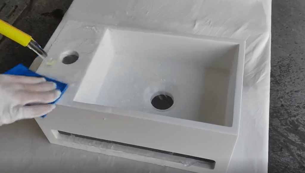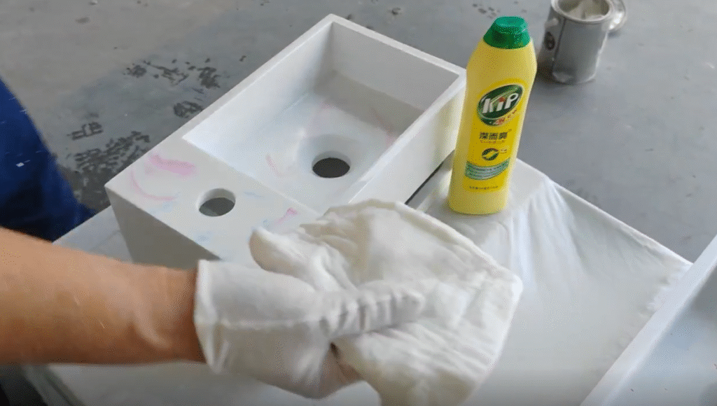After sanding, clean the basin with water and dry completely. If needed, apply a small amount of solid-surface restoration cream or light finishing compound to even out texture. The result should be a uniform, smooth matte surface free of visible stains.