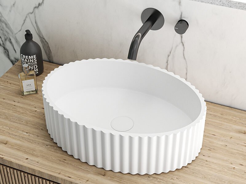 Ceramic is the most widely used basin material across the industry. It is cost-effective, widely available, easy to manufacture at scale, and performs well in standard residential and commercial settings. It is a dependable choice for apartment developments, standard hotel rooms, and any project where budget efficiency is a priority without compromising on cleanliness or basic durability. It is not as seamless or repairable as solid surfaces, but it covers the majority of standard use cases reliably.